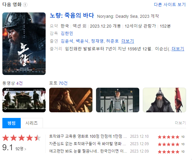 In December 1598, seven years have passed since the Japanese invasions of Korea broke out. Yi Sun-sin (Kim Yun-seok) learns that the Japanese army is urgently trying to withdraw from Joseon after the sudden death of Toyotomi Hideyoshi, the leader of the Japanese army. "The war should not end like this." Yi Sun-sin believes that completely defeating the Japanese army is the right way to end this war, and decides to organize a joint fleet of the Ming Dynasty and Ming Dynasty to block the Japanese army's withdrawal route and kill all enemies. However, Jinrin (Jeong Jae-young), a grave robber from the Ming Dynasty, tries to open a withdrawal route for the Japanese army by accepting bribes from the Japanese army, and even receives the help of the dashing Japanese army leader Shimazu to help the Japanese army withdraw. December 2023 , the final battle that will overwhelm everyone begins!