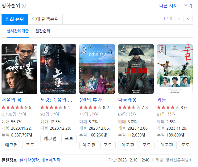 최신영화 best3 실시간예매율 12월 극장에 가려고 하시나요? 서울의 봄 개봉 10일 만에 300만이 돌파되었습니다. 아래에서 실시간예매율 현재상영작, 개봉예정작을 확인하실 수 있습니다. 서울의