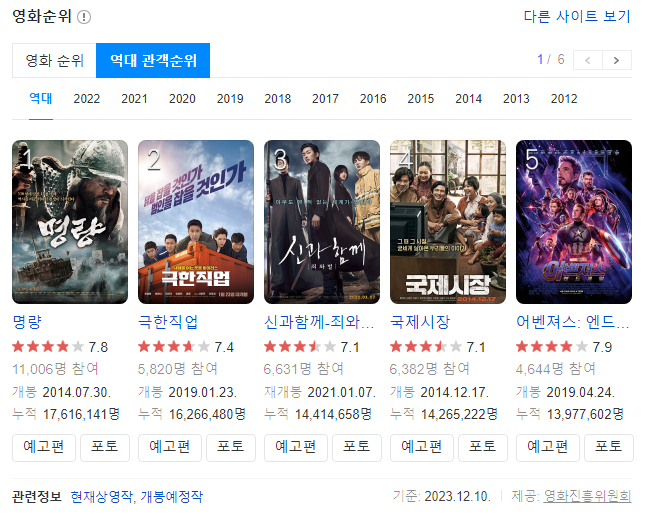 영화 서울의 봄이 개봉 18일 만에 관객 600만 명을 돌파했습니다. 그동안 어려운 환경 속에서 침체기를 겪고 있는 극장가에 돌풍을 일으키고 있습니다. 아래에서 12월 10일 최신 영화 순위 및 역대 관객 순위를 확인이 가능합니다.